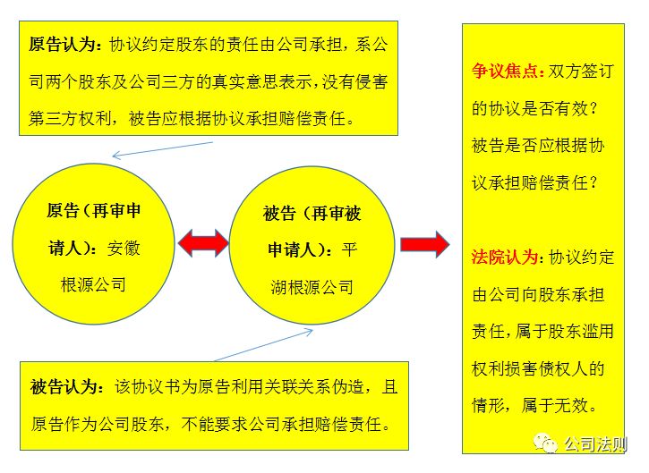 案例名称:安徽省根源光大节能建材有限公司与平湖根源光大节能建材有限公司合同纠纷 案例来源:浙江省高级人民法院(2015)浙商提字第29号 案情摘要: 2011年4月9日,安徽根源公司与兴贸公司签订《合作协议书》,约定投资设立平湖根源公司。由兴贸公司负责筹集资金,安徽根源公司负责技术投入和生产管理。 2012年10月17日,安徽根源公司和平湖根源公司签订《协议书》一份,约定:平湖根源公司年产300万平方米项目设备于2012年12月份前必须全部到位,2012年12月12日正式投产,如未能达到上述条件,平湖根源公司自愿按每天15万元承担赔偿安徽根源公司经济损失,还约定安徽根源公司除自身承接的工程外,不得对外销售和生产相关设备配套产品,自平湖根源公司正式投产后全部由平湖根源公司签订承接工程合同;如安徽根源公司违反约定,自愿按每天15万元承担赔偿平湖根源公司经济损失。 安徽根源公司诉称,因兴贸公司未按约定筹集资金,导致平湖根源公司未能正式投产,违反了《协议书》的约定,请求法院判令平湖根源公司赔偿安徽根源公司经济损失。 法律关系图 一审审理: 再审申请人(一审原告、二审上诉人):安徽省根源光大节能建材有限公司。 被申请人(一审被告、二审上诉人):平湖根源光大节能建材有限公司。 平湖市人民法院一审查明,2011年4月9日,安徽根源公司与兴贸公司签订《合作协议书》,约定投资设立平湖根源公司,注册资本5000万元,安徽根源公司出资1000万元,占20%,兴贸公司出资4000万元,占80%。兴贸公司协助筹集平湖根源公司发展所需要的资金,安徽根源公司负责向平湖根源公司有偿提供生产的全部技术以及后续升级技术。2011年4月19日,安徽根源公司与兴贸公司签署《平湖根源公司章程》。2011年6月15日,平湖根源公司通过股东会决议,将公司注册资本增至15000万元,增资部分安徽根源公司和兴贸公司按出资比例认缴,增资部分的出资期限为营业执照变更之日起两年内缴清。2012年1月3日,安徽根源公司与兴贸公司签订《补充协议书》,约定增加的10000万元注册资本分两次到位,于2012年3月前到位5000万元,2012年6月前到位5000万元。其中安徽根源公司认缴的增资2000万元,兴贸公司保证由其母公司借款给安徽根源公司,由安徽根源公司与兴贸公司母公司签署《借款合同》,兴贸公司负责将该借款在章程规定的时间内汇至安徽根源公司账户,由安徽根源公司用于支付增加的注册资本。如借款不能及时到位,兴贸公司不得追究安徽根源公司的违约责任。截至2012年8月2日,平湖根源公司累计实收注册资本10000万元,尚有5000万元未到位,其中安徽根源公司尚欠注册资本1000万,兴贸公司尚欠注册资本4000万。兴贸公司保证其母公司提供给安徽根源公司的2000万元借款,尚有1000万元未到位。 2012年10月17日,双方签订《协议书》一份,约定:平湖根源公司年产300万平方米项目设备于2012年12月份前必须全部到位,2012年12月12日正式投产;如因平湖根源公司股东之间资金的问题致年产300万平方米项目设备不能全部到位,不能按约定时间在2012年12月12日正式投产的,平湖根源公司自愿按每天15万元承担赔偿安徽根源公司经济损失(从2012年12月12日起至平湖根源公司正式投产开业止);从2012年10月17日起至平湖根源公司正式投产期间,安徽根源公司除自身承接的工程外,不得对外向其他单位和个人销售安徽根源公司生产的外墙一体板系列扣件及内墙装饰线条系列部分;平湖根源公司正式投产后安徽根源公司不再生产同类型内、外墙板材,只生产内、外墙板材扣件(含装饰线条)系列的配套产品并按市场优惠价专供平湖根源公司使用;自平湖根源公司正式投产后全部由平湖根源公司签订承接工程合同,安徽根源公司不再承接内、外墙工程项目;如安徽根源公司违反约定,安徽根源公司自愿按每天15万元承担赔偿平湖根源公司经济损失(从2012年10月17日起至被告平湖根源公司解散止)。 平湖市人民法院一审认为,当事人行使权利、履行义务应当遵循诚实信用原则。依法成立的合同,对当事人具有法律约束力。当事人应当按照约定履行自己的义务,不得擅自变更和解除合同。本案争议的焦点主要包括:一、双方于2012年10月17日签订《协议书》效力问题;二、是否系因为平湖根源公司股东之间资金问题致年产300万平方米项目设备不能按约全部到位,未正式投产;三、平湖根源公司是否应承担违约责任及责任范围问题。 针对争议焦点一。《协议书》的签约主体虽为安徽根源公司和平湖根源公司,但从平湖根源公司印章使用登记情况看,平湖根源公司另一股东兴贸公司系知晓《协议书》签订内容的。该《协议书》实际应为平湖根源公司两股东间真实意思表示,仅是约定兴贸公司责任由平湖根源公司承担,故由安徽根源公司和平湖根源公司签订《协议书》。综上,《协议书》系各方真实意思表示,也未发现有损害社会公共利益和案外人利益的情况,也不违反法律、行政法规的强制性规定,应为合法有效。 针对争议焦点二。平湖根源公司两股东之间分工为兴贸公司协助筹集平湖根源公司发展所需要的资金,安徽根源公司负责向平湖根源公司有偿提供生产的全部技术以及后续升级技术。平湖根源公司2012年9月10日董事会会议记录(平湖根源公司证据一)载明了安徽根源公司和兴贸公司分工情况及开业还需要设备、资金等